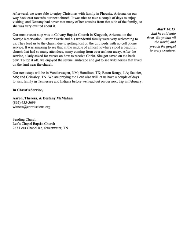 Monthly Prayer Letter